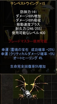 当初はナイト現物羽+13に生命OPをつけようかと考えましたが、ギルメンに相談して敏エル用に温存していたファントムウィング+15をテンペストに変えてもらいました。