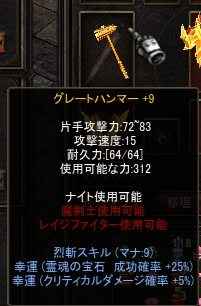 ナイト諸氏はご存知かと思いますが、片手メイス(ハンマー)スキル付の最強武器はいまだにモーニングスターです。N+15で攻撃力は79-88です。グレートハンマーはもともと両手メイス。N+15でなんと攻撃力は111-112。片手メイスならもちろん最強。
