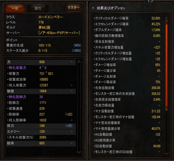 力はアントニアス+13op16要求で統率はダークスピリッツL70要求です。エナジー初期だとMPきついから気持ち残して、体力も気持ちだけ。あとは敏捷に振ってみました。攻撃速度229から繰り出さられるウィンドソウルはなかなか殲滅力あります。